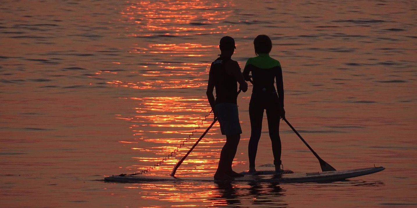大きなサーフボードの上に乗り、オール(パドル)を使って漕ぎ水上を滑るマリンスポーツです。